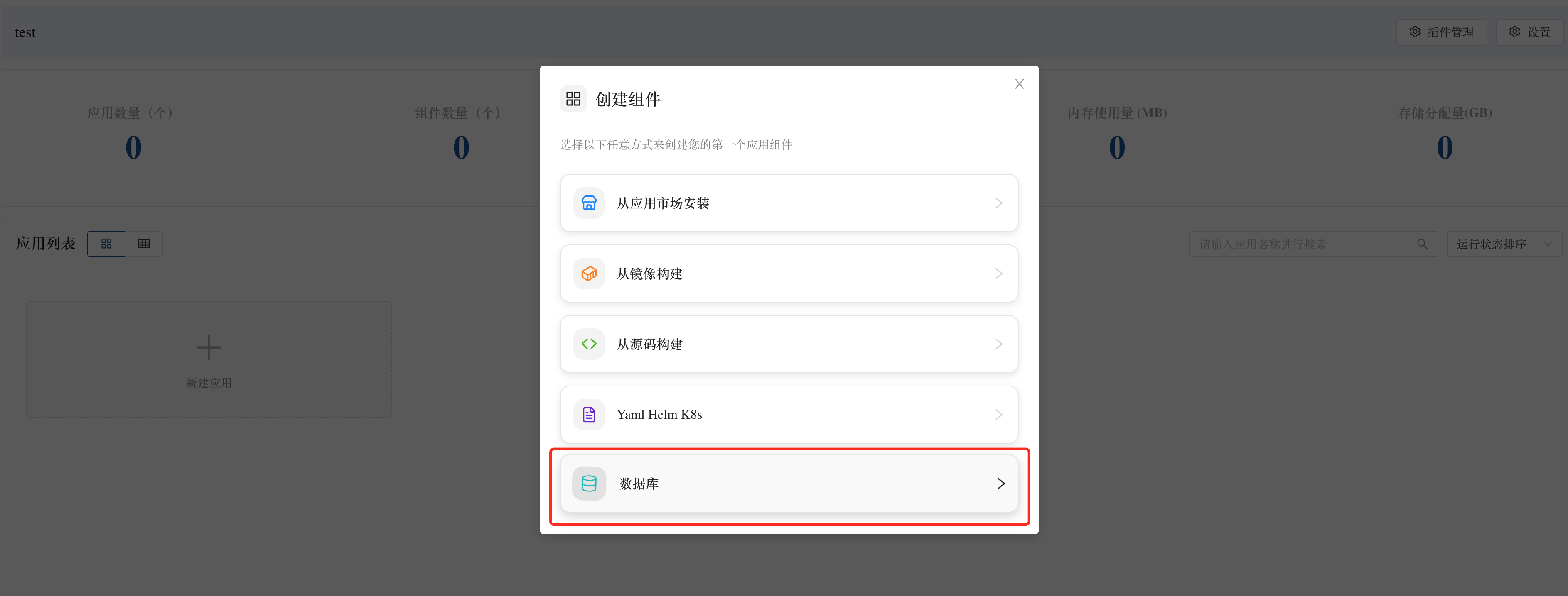 • 登录 Rainbond 控制台 → 进入任意团队 → 新建应用可以看到 数据库 选项