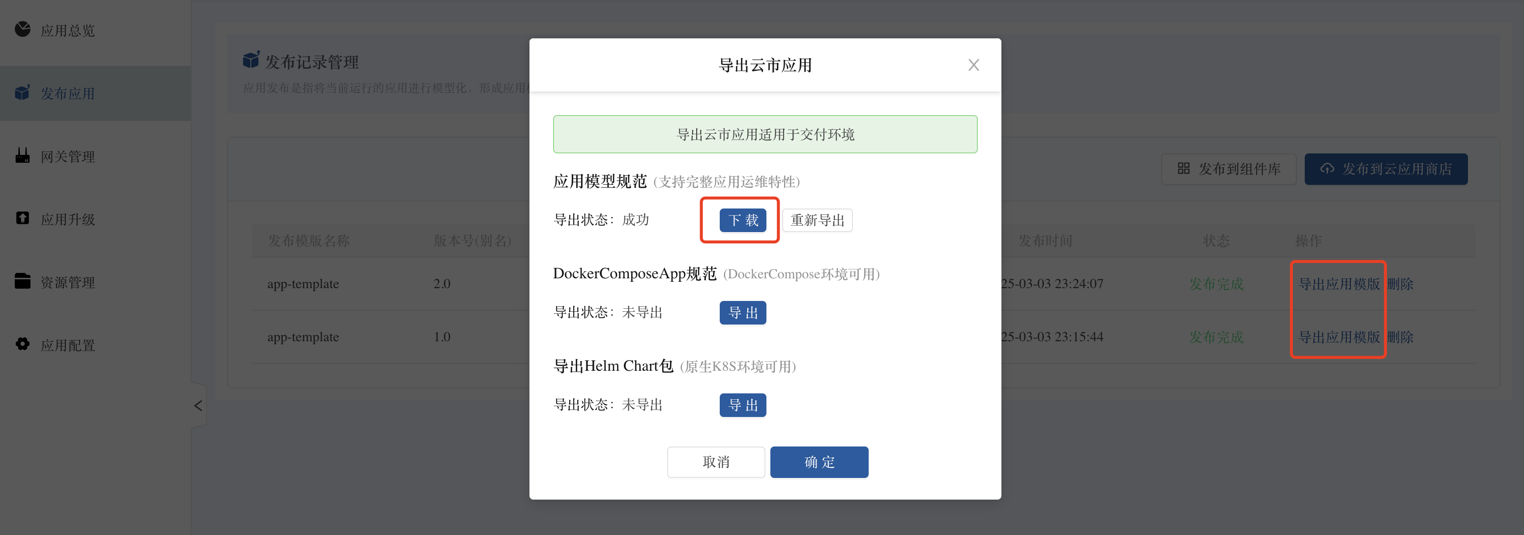 - 进入应用视图 ➡️ 发布应用 ➡️ 导出应用模板,导出应用模型规范。